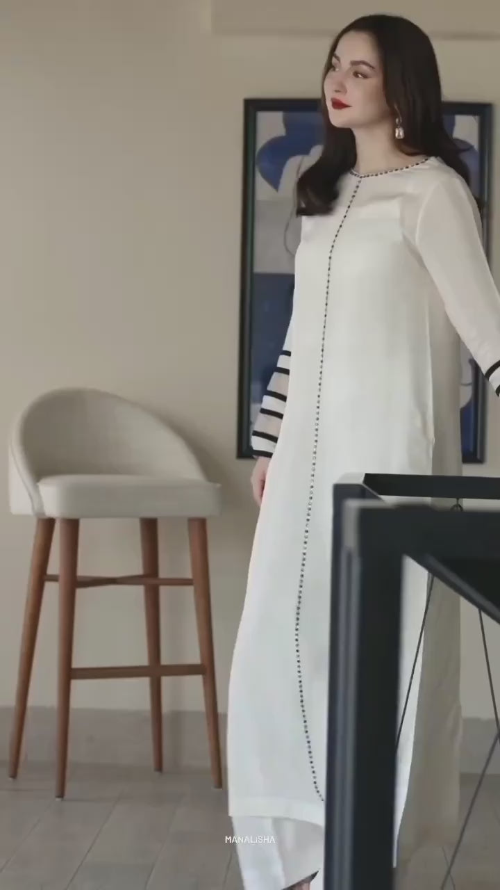 *Introducing the Royal Organza Eid Suit, inspired by Hania Amir. This unstitch 3-piece set features a 50-inch organza shirt with intricate appliqué work on the sleeves, complemented by a plain Kattan silk trouser and inner. Crafted for elegance, it ensures comfort and a refined aesthetic for Eid celebrations.
